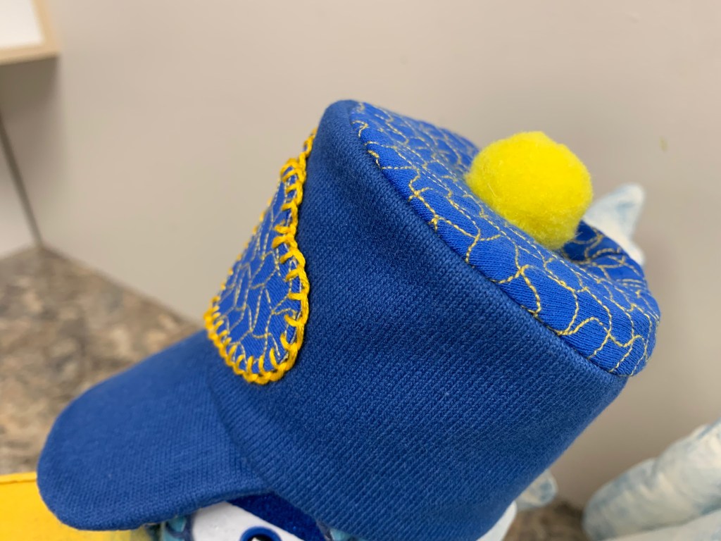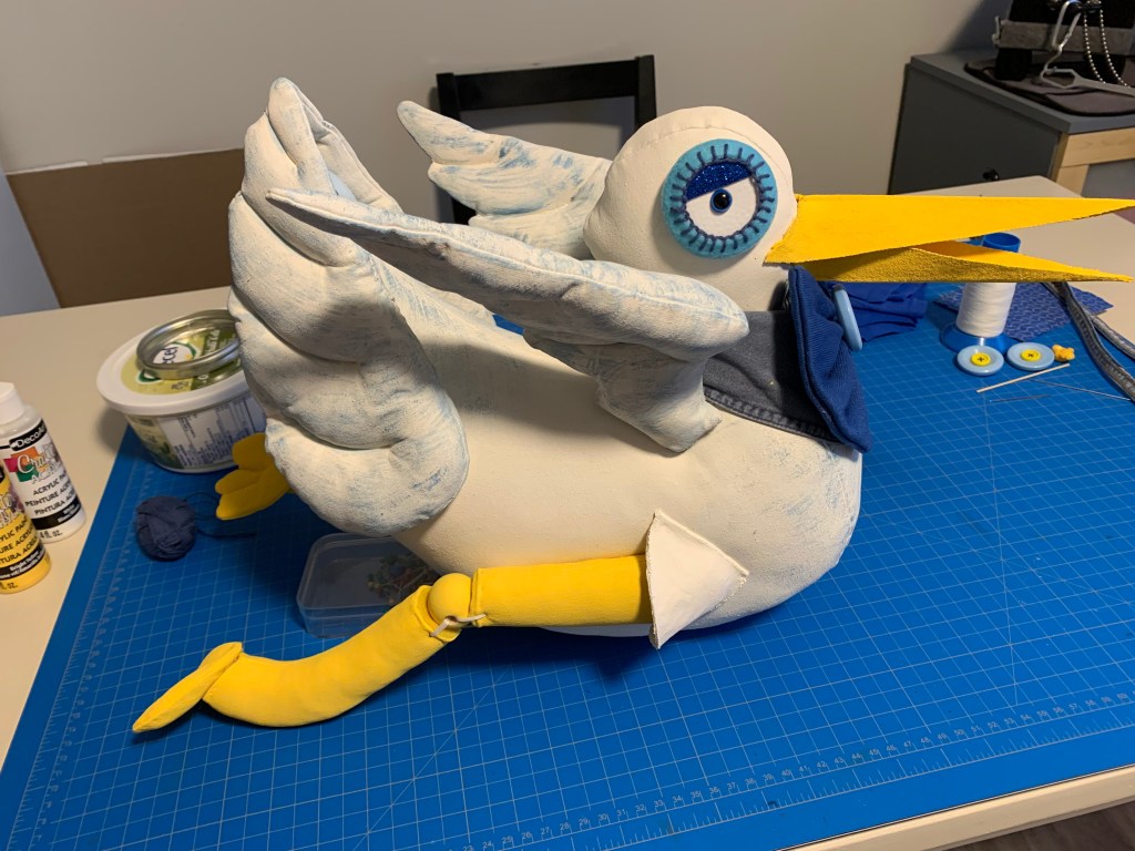 The legs were a particular highlight of this project. To recreate the curved, jointed look, I used wooden balls with holes in them as joints between the canvas leg sections. I painted them a vibrant, sunny yellow to match the beak, which really made the whole piece pop!