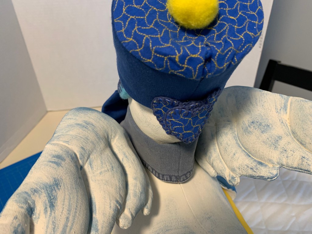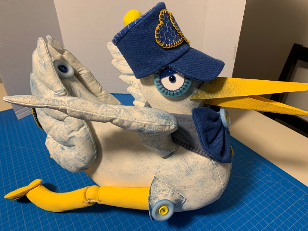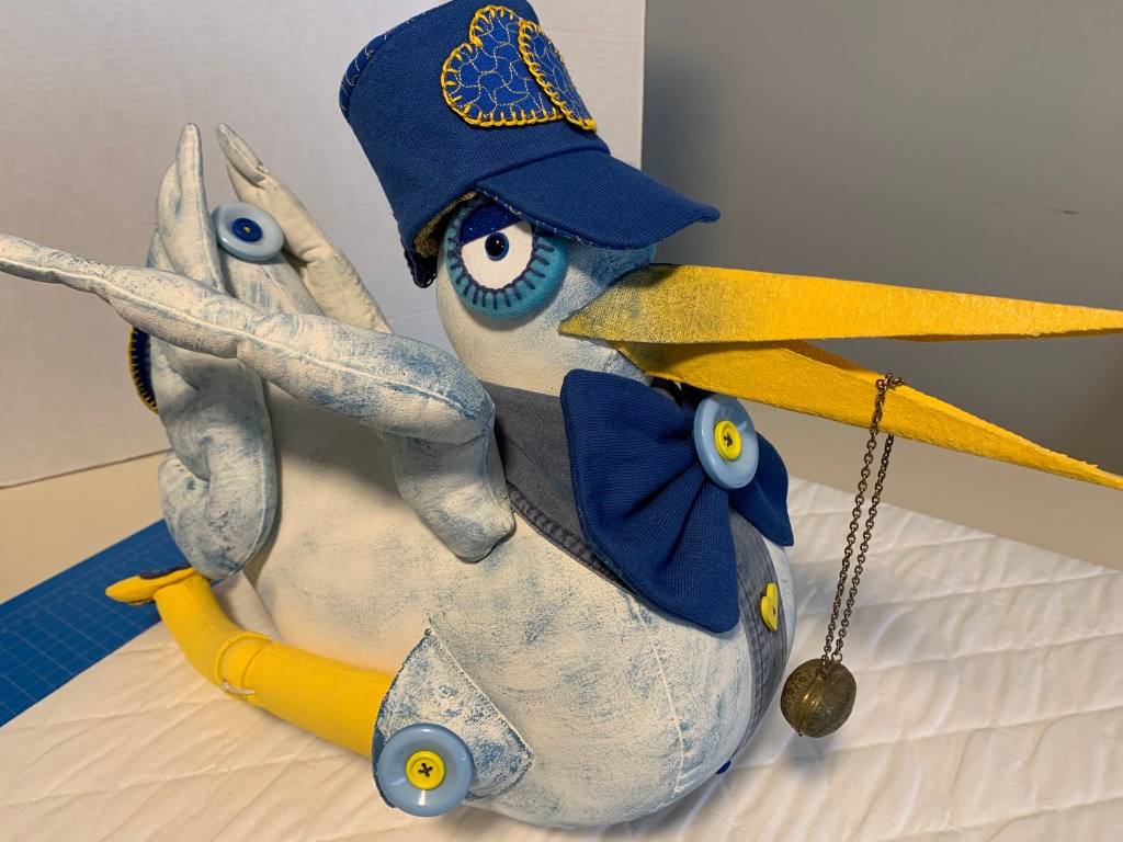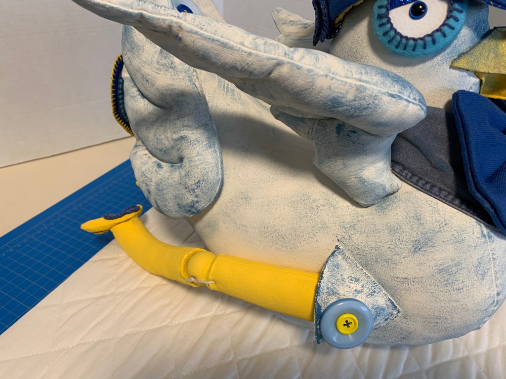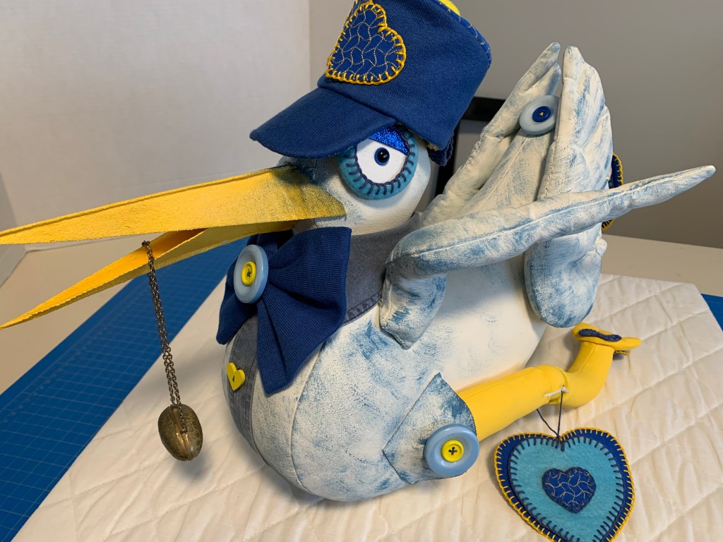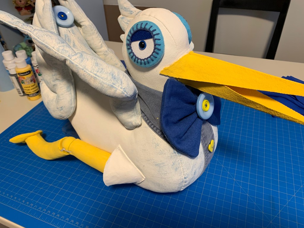 Once the body was sewn and stuffed with polyester filling, it was time for the “glitz.” I used affordable acrylic paints from the local shop. To get that beautiful, textured look from the original Mexican piece, I used a technique called stippling. I painted the base and then dapped on blue specks to give the stork a lovely character.