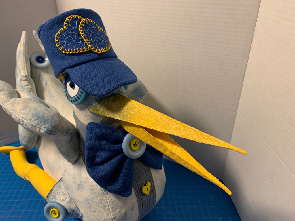 To move from a flat shape to a plump, three dimensional bird, I used gussets. A gusset is a wonderful piece of fabric that adds depth and space. I inserted a long gusset from the tip of the beak, all the way under the body, to the tail. I even added a gusset to the head so it would be sturdy enough to hold a jaunty little hat later on.